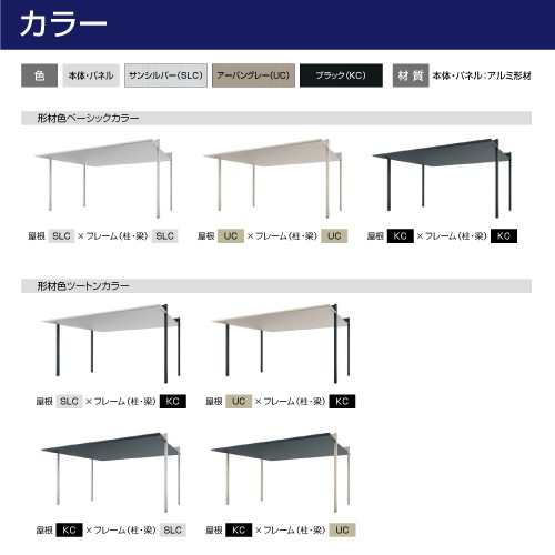 カラーは、屋根と柱・梁を同色で統一するベーシックカラーのほか、屋根と柱・梁の色を異なるツートンカラーも選択可能です。