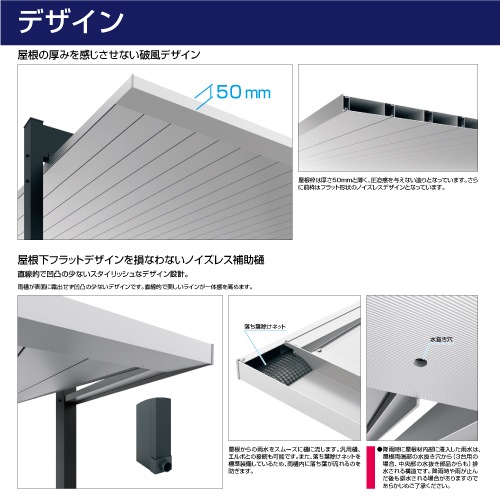 丸樋を使用しない新たな排水設計により、屋根下も凹凸が少なく、ノイズレスなデザインとなっています。