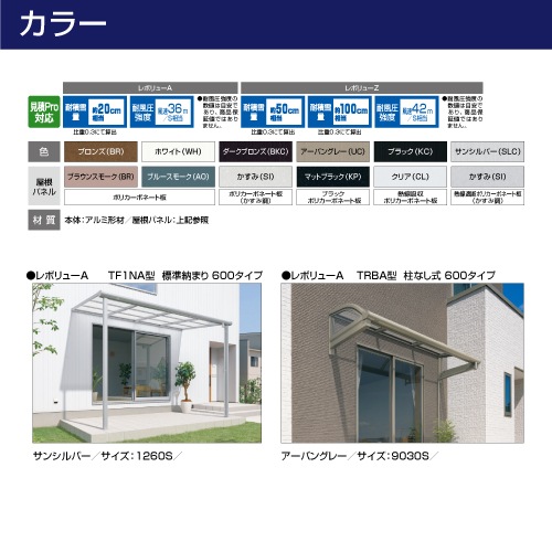屋根材は、ポリカーボネート板(ブラウンスモーク、ブルースモーク、かすみ調)、防汚ポリカーボネート板(クリア)、熱線吸収ポリカーボネート板(クリア)、熱線遮断ポリカーボネート板(かすみ調)から選べます。