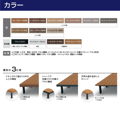 人工木幕板仕様:床材と同じ人工木の幕板を使用し、ナチュラルで温かみのある印象を演出します。コーナーキャップも木調のテクスチャを採用し、統一感を高めています。