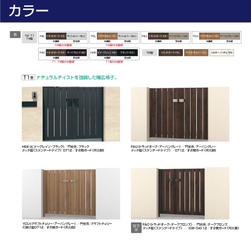 フレイナ門扉は、木調部と形材部を組み合わせたデザインで、住宅の外観と調和します。上端部、上桟部、たて框、すき間ガードなどの細部にも木目の風合いを演出し、高級感のある意匠が特徴です。