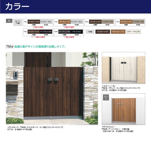 フレイナ門扉は、木調部と形材部を組み合わせたデザインで、住宅の外観と調和します。上端部、上桟部、たて框、すき間ガードなどの細部にも木目の風合いを演出し、高級感のある意匠が特徴です。