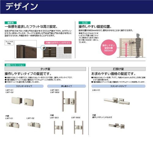 錠前位置が980mmに設定されており、腰をかがめることなく操作できます。また、車椅子からでも開閉しやすい設計となっています。